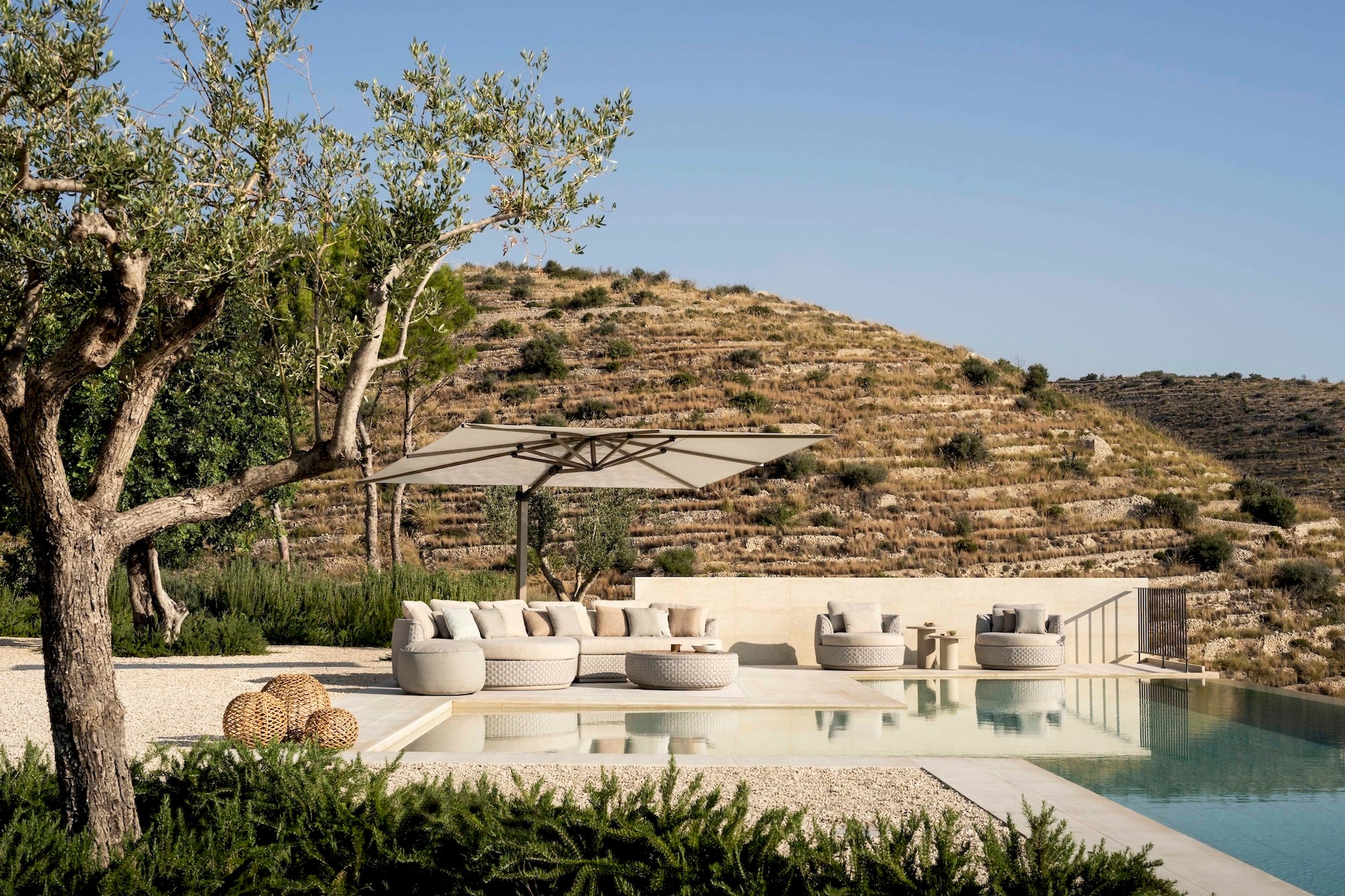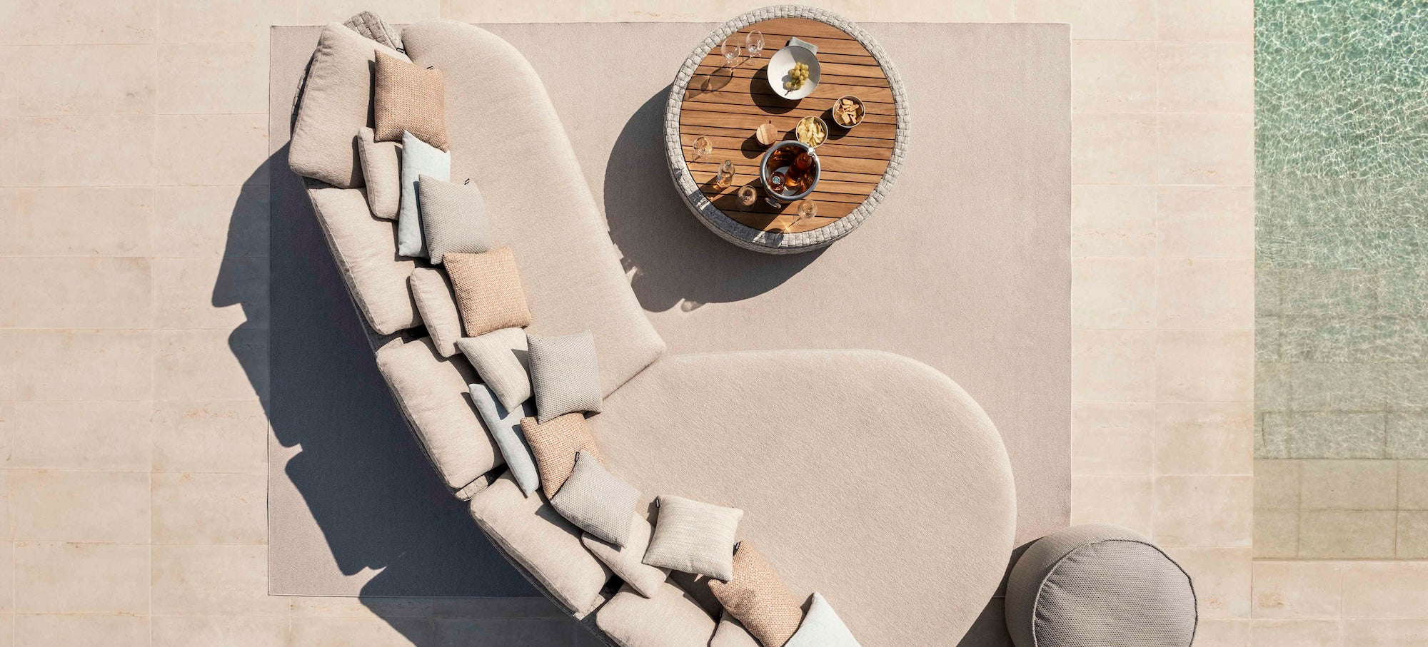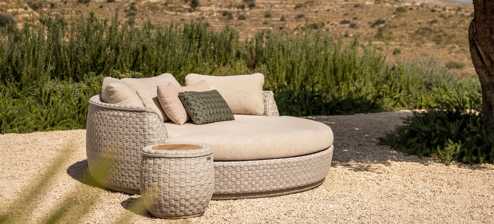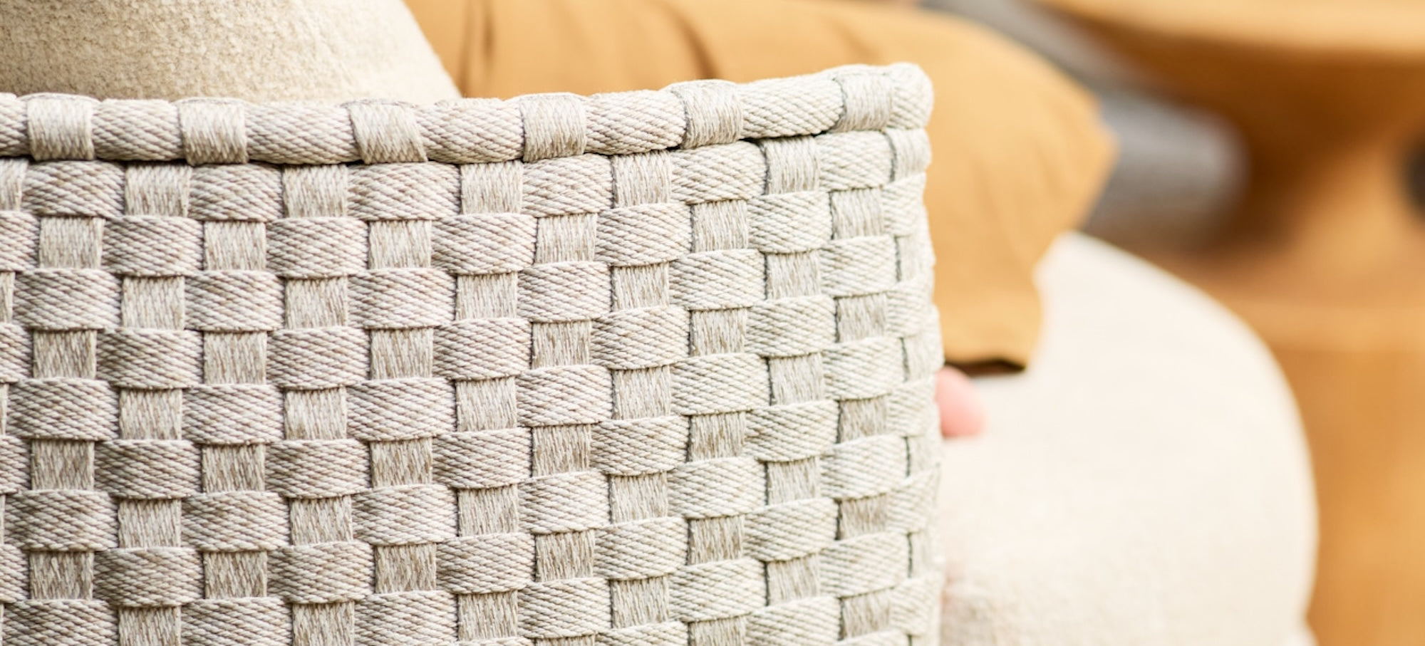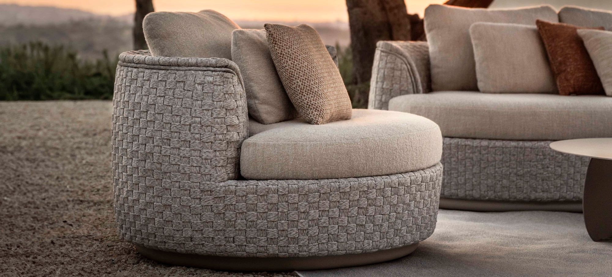 The bold rope detailing is beautifully balanced by the strong, streamlined powder-coated aluminium frame in a soft linen shade, lending the collection a modern sophistication. With swivel components woven naturally into the design, the rounded organic shapes create a graceful and continuous flow.