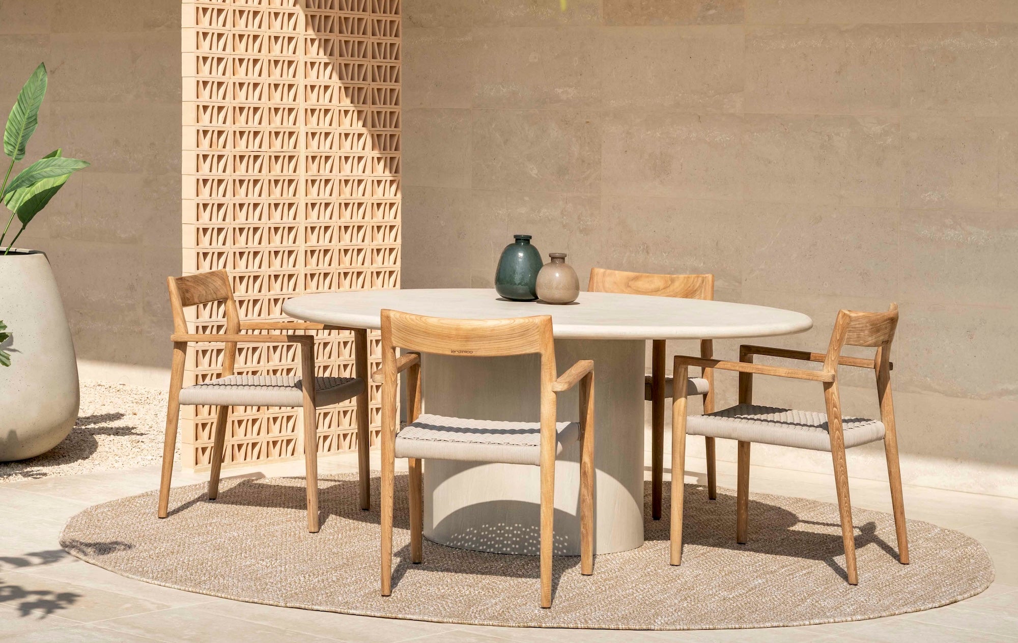 The Jardinico Legna collection showcases coordinated dining settings with sleek, flowing lines. It celebrates authentic craftsmanship that blends seamlessly with the colors and materials of nature. Each piece is thoughtfully designed to elevate your outdoor dining experience with understated sophistication.